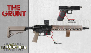 Grunts are the backbone of America’s finest, often served fully-equipped with these very firearms that you can shoot at our firing range in Las Vegas. Armed with the M4 machine gun and the always reliable Glock 9mm, you’ll love the experience at the best firing range in Las Vegas, the Vegas Machine Gun Experience.